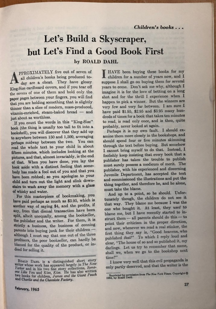 While collecting Roald Dahl’s short stories poses challenges, collecting the magazines containing articles and interviews will likely keep one busy for a lifetime – there are many and some are extremely difficult to find. This article is by no means comprehensive – it only represents the ones I have acquired over a number of years.